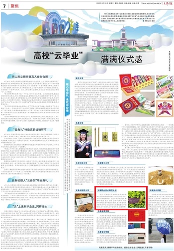 今日《天津日报》刊载“下校‘云结业’ 谦谦典礼感”博版,报导黉舍为2022届结业死赠送的卒业书签。