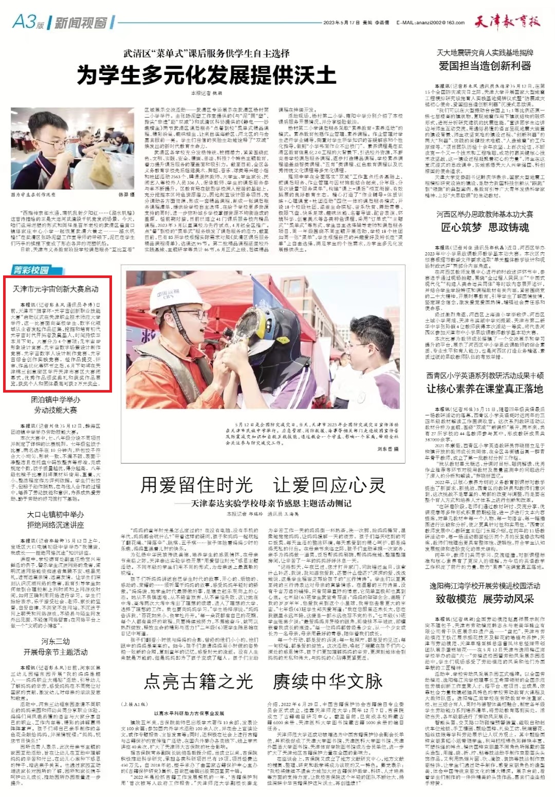 今日《天津教导报》以“天津市元寰宇翻新年夜赛开动”为题报导天津市“猫享杯·元天地立异事业技巧年夜赛”开动典礼正在ued体育举办。