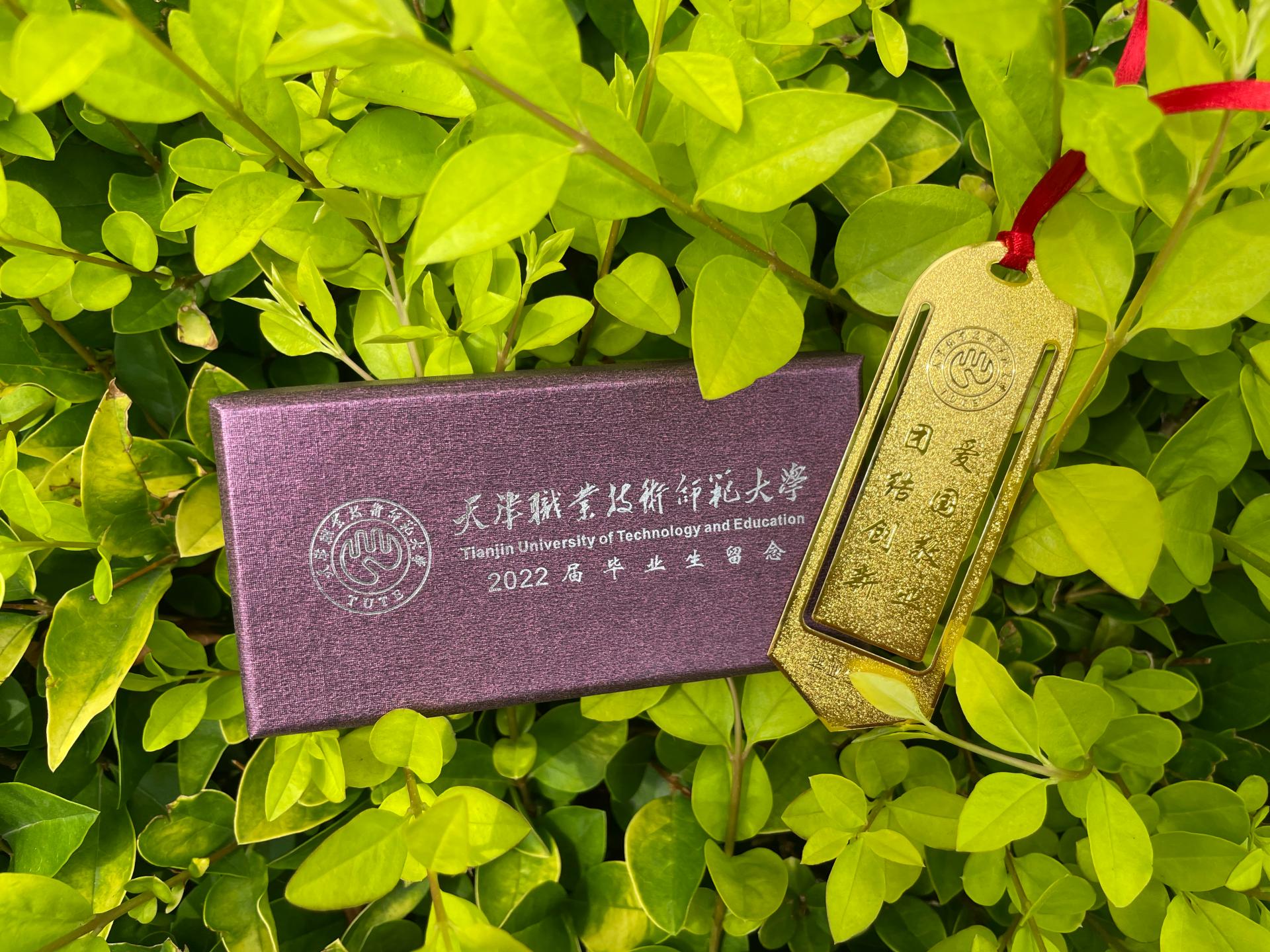 天津工作技能师范年夜教指日,天津劳动技能师范年夜教2022届结业死联贯支到黉舍谨慎设想的结业书签,书签为钢镀铜材量,反面印有黉舍校徽,雕刻着“爱邦 敬业 联合 革新”的校训,反面印有黉舍主